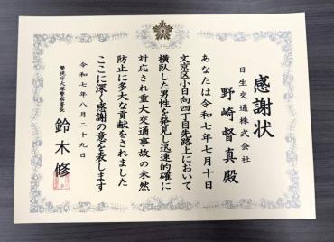令和7年7月10日に路上横臥者を発見し、迅速な救助活動を行ったことで本日8月29日に弊社の野崎乗務員が大塚警察署より表彰されました!